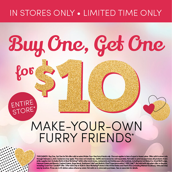 Exclusive Coupons | Build-A-Bear Workshop Exclusive Coupons $10 Off A Purchase of $30 or More US Disclaimer: Coupon expires December 20, 2018. Valid on eligible Build-A-Bear Workshop® furry friends, clothing and accessories.