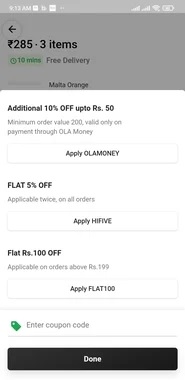 Ola Dash/ store coupon - Get Rs.100 Off on Above Rs.300 Orders - Desidime Ola Dash get flat 100 off on order above 300 Coupon : RIDE100 Use with existing 30%-50% on product to make it loot deal Quote 6 narpar02 7 months ago Mostly items are out of stock Quote narpar02 7 months ago Payment goy stuck also Quote pbcmehul 7 months ago Ordering from ola dash is a headache. Long customer care wait time, missing items. 75% Off olacabs.com Coupons & Promo Codes, September 2022 Remember that good Ola Select Coupon coupons are hard to come by! Get Code Great Offer Sign Up & Get Rs. 100 Off Your First Ride Be budget savvy with this excellent deal, use Ola Select Coupon coupon. Be the first to know, first to shop, and first to save! Get Code Great Offer 100% Cashback On Ola Cabs Prime In Bangalore
