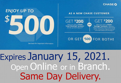 Chase Bank Promotions for October 2022: $100, $200, $300, $500, $625 ... How to earn it: Get a coupon code from the offer page and open an eligible account online or in-branch. Deposit a total of $2,000 or more in new money into your new checking account within 30 business days of account opening and maintain at least $2,000 balance for 60 days from the date of deposit. ... Chase Sapphire SM Checking- Open a new ...