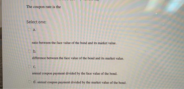 What is the difference between coupon rate and market - Course Hero The market can also give a premium rate that is greater, than a discount rate. The reason its called a coupon rate is that before electronic investing each bond that was issued is made of paper called coupons. These were issued to redeem for money.
